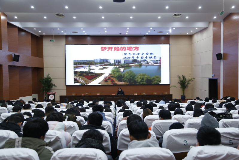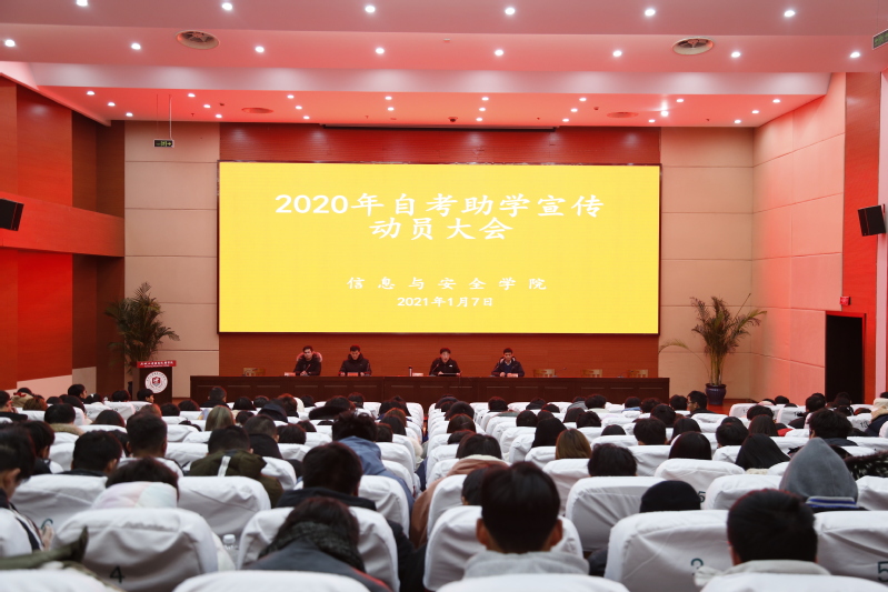 2021年1月7日晚7点信息与安全学院在学术报告厅召开2020级新生自考助学宣讲会。参加本次大会的有信息与安全学院院长陈杰,副院长王国军,继续教育学院赵国良老师,自考助学班主任林伟民及2020级全体新生。大会由副院长王国军主持。